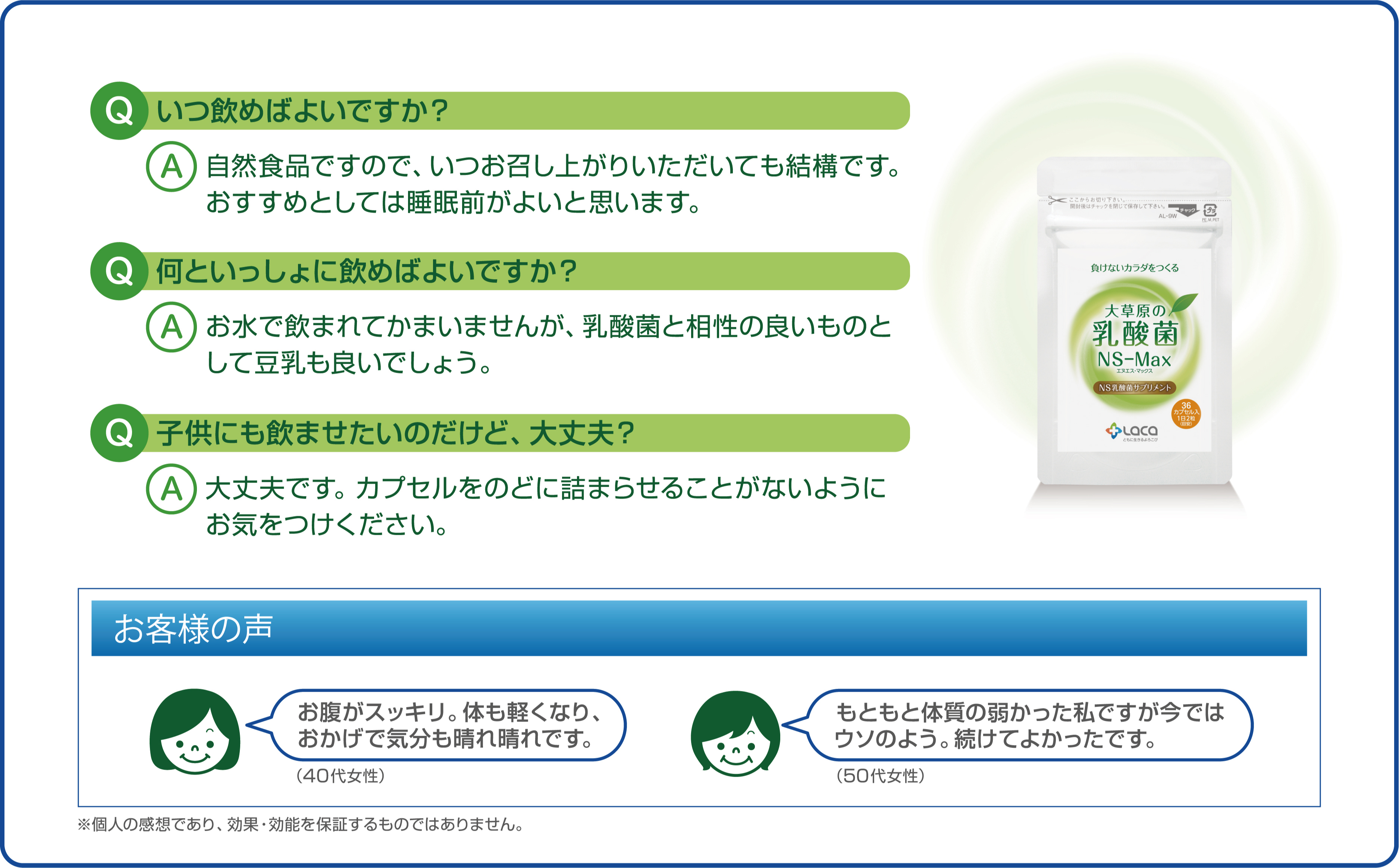 もともと体質の弱かった私ですが今ではウソのよう。続けてよかったです。(50代女性)
